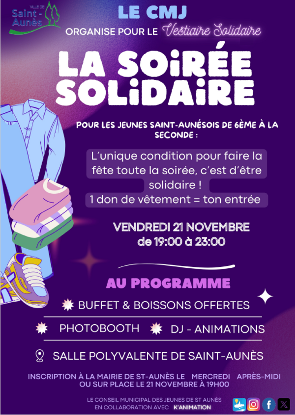 Ce vendredi 21 novembre, le CMJ organisela Soirée Solidaire à partir de 19h, à la salle polyvalente de Saint-Aunès.