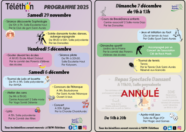 Du samedi 29 novembre au dimanche 7 décembre 2025, venez participer aux activités proposées par les associations de Saint-Aunès et ainsi faire votre don pour le Téléthon.