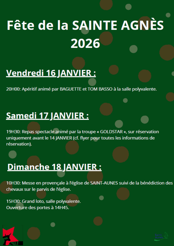 • Samedi 17 JANVIER : 19H30: Repas spectacle animé par la troupe « GOLDSTAR », sur réservation uniquement avant le 14 JANVIER (cf. flyer pour toutes les informations de réservation).